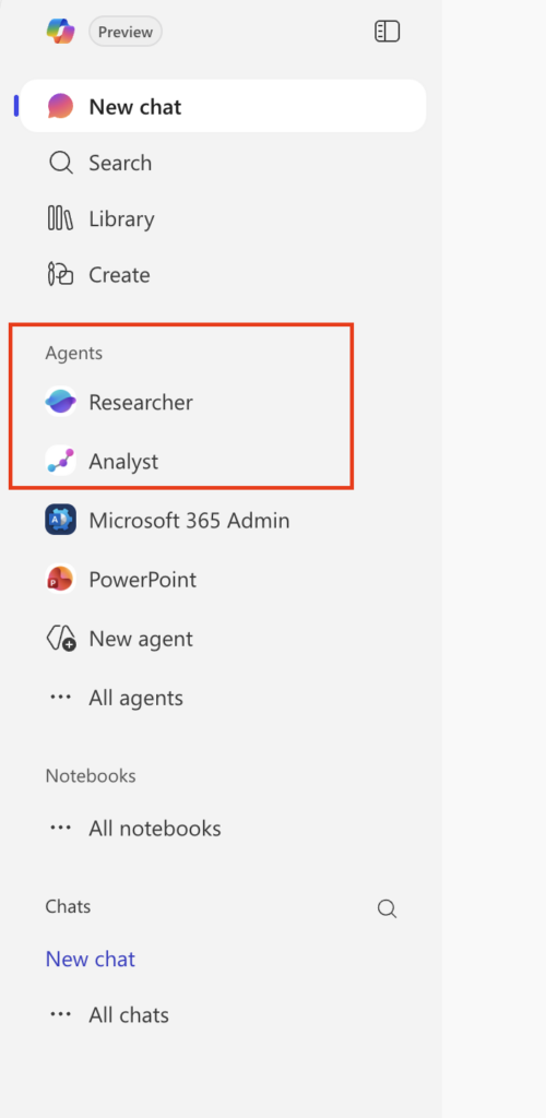 So, in M365 Copilot Chat, you can see Researcher and Analyst in the left-rail like this: