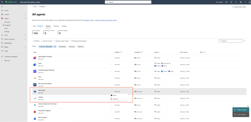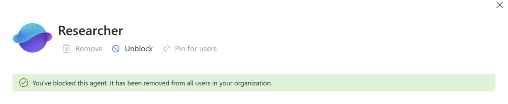 Now what? Well, you can explicity block them. Let’s turn the agents back on that we turned off just above. Then navigate back to M365 Admin -> Agents -> All Agents. You can Block – for example – Researcher.